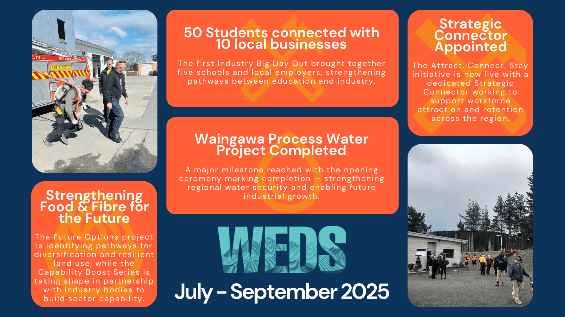The Wairarapa Economic Development Strategy (WEDS) is a regionally-owned plan to grow a resilient, future-focused economy - one that reflects the unique character of Wairarapa and supports what makes our region thrive. At its heart is the WEDS Work Programme, where strategy becomes action. Through this programme, local councils, iwi, businesses, and community leaders work together to tackle the region’s biggest challenges and unlock new opportunities. Whether it's securing long-term water resilience, strengthening our food and fibre sector, or building a skilled workforce for the future, WEDS is about creating lasting, locally led impact - for today and for generations to come.